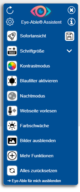 Mit einem Klick auf das Männchen-Logo erscheint das Auswahlmenü. Es stehen Funktionen wie Vorlesemodus, Kontrastanpassung und größere Schrift, damit Menschen mit Sehbeeinträchtigungen Webseiten besser nutzen können, zur Verfügung. Weitere Funktionen sind: